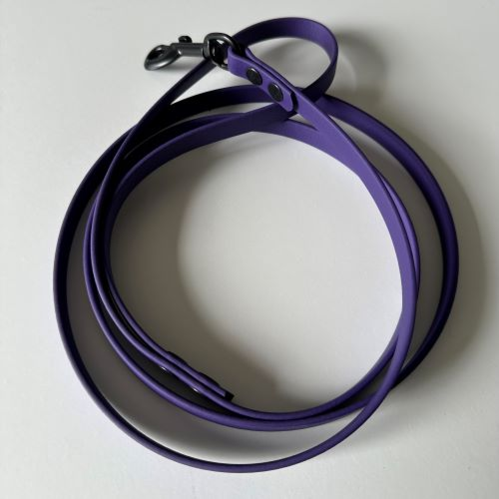 Vaste lijn van1.50mtr lang 12mm Biothane paars met zwarte musketon en holnieten