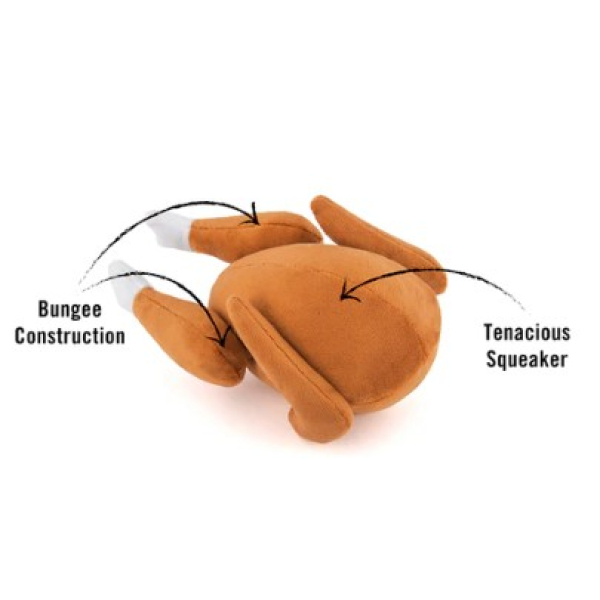 Binnenin zit een piepbal en aan de kippenpoten zit bungeetouw voor nog meer plezier